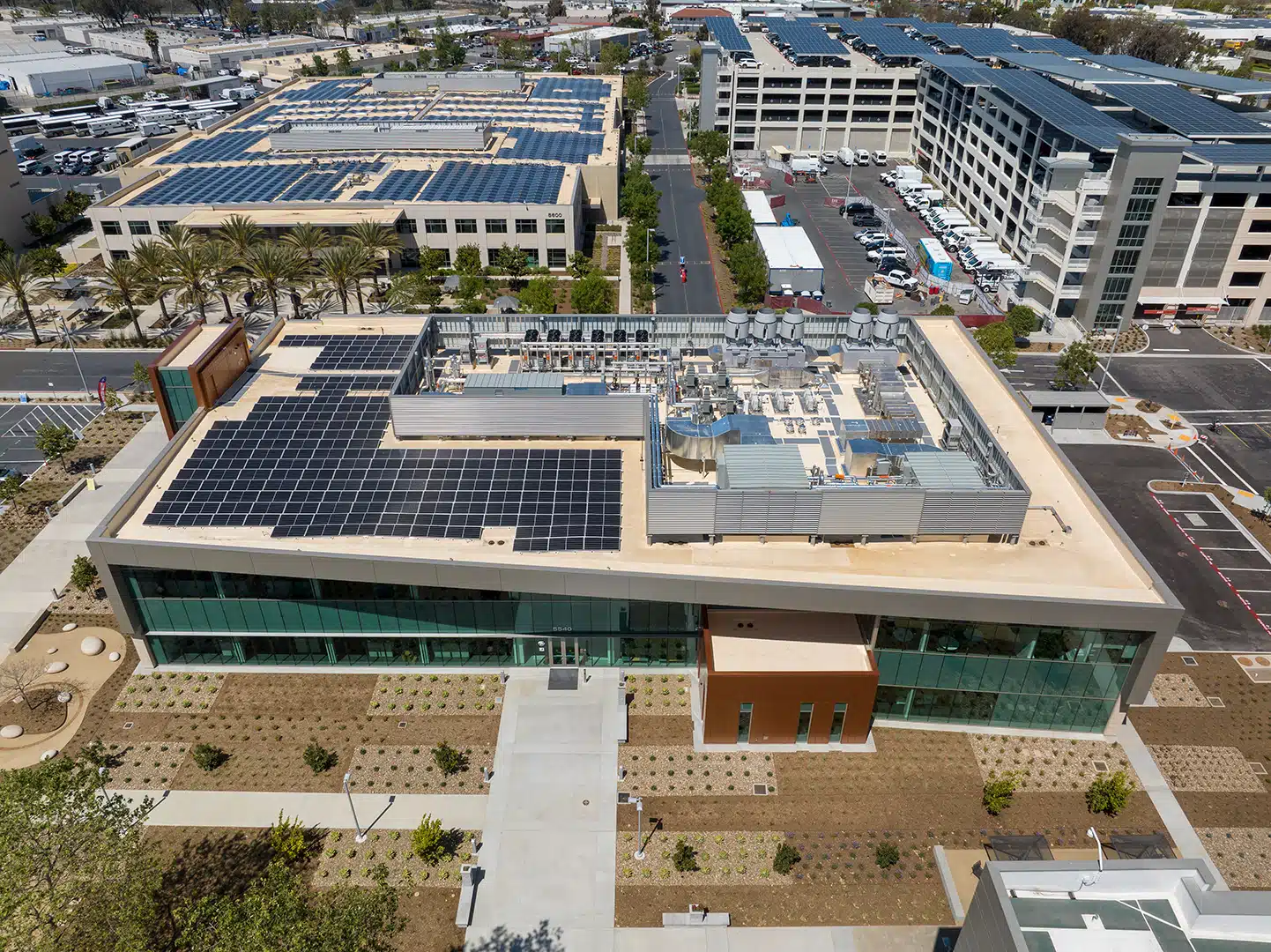 While net zero energy was not feasible for this laboratory facility, the project advanced the County’s decarbonization goals through an all-electric design. Sized by Stok, onsite and nearby County-owned solar arrays are predicted to generate 805,000 kWh annually—offsetting 44% of the building’s energy use—supported by a rooftop battery system that reduces peak demand stress on the grid and reduces peak demand charges for the County.