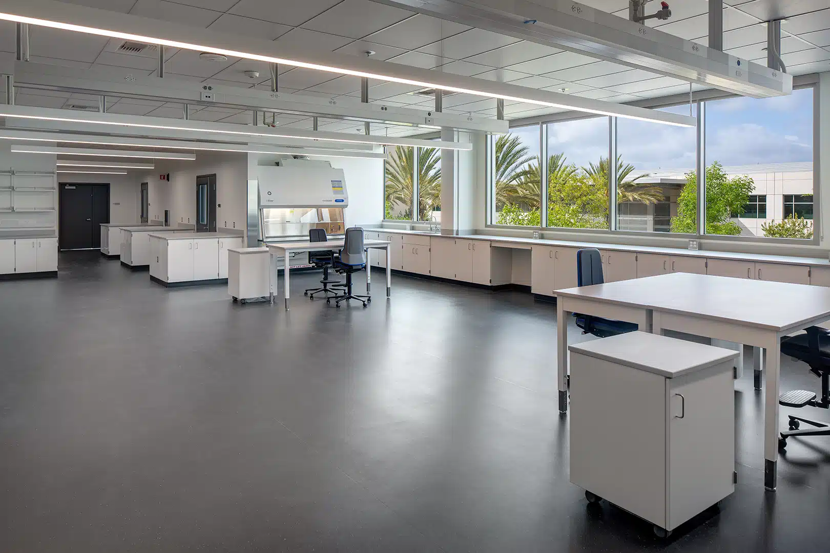 To advance the County’s decarbonization goals, Stok modeled embodied carbon impacts through a Whole Building Life Cycle Assessment (WBLCA) from schematic design through completion, guiding the team in making data-driven material decisions within the lab’s stringent design parameters. While supplemental structural optimization strategies such as hybrid steel/timber framing were evaluated, they were ultimately not feasible due to the lab facility’s strict vibration requirements for microscope use. Despite the non-negotiable lab design constraints, the project achieved a 23% embodied carbon reduction through: